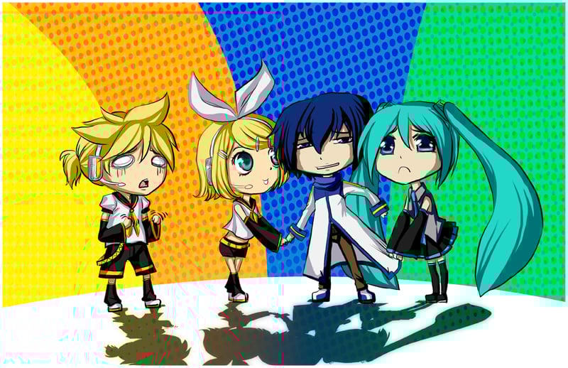 11x17 fanart print on cardstock, of your favorite vocaloids; Hatsune Miku, Rin, Len, and Kaito! It looks like they're all having a little trouble getting along though...